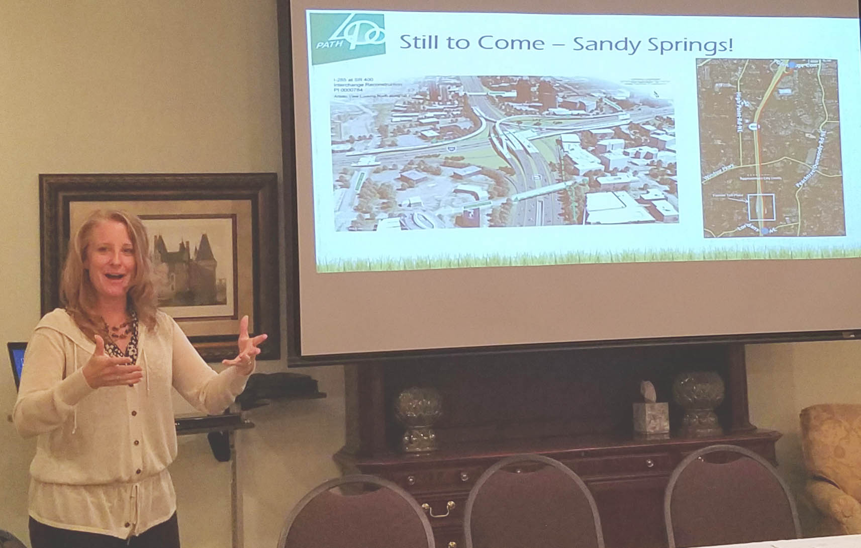 Denise Starling is Executive Director of Livable Buckhead, Inc. (LBI) PATH400 is a Livable Buckhead project. She said that LBI’s mission is to support the area’s sustainability, with greenspace being an important component. In 2009/10 the City of Atlanta did an analysis of park space by city council district and determined that Council District 7 was the lowest “parked” district in the city. A 25-person stakeholder committee was organized to determine a plan to address that greenspace deficiency. It was determined that 106 acres of parks needed to be added in District 7. That goal will include a variety of different type of parks, not just greenspace.