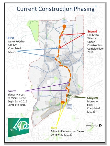 These three entities together manage the project. Various government agencies are involved. The land predominately belongs to the Georgia DOT. GDOT granted the City of Atlanta a special permit to allow it to use the land as a park. The initial plan for PATH400 extended from the area near the I-85/GA400 interchange north 5.2 miles to Loridans Drive. So far, several segments have been completed. The initial segment which opened in early 2015 extended along Lenox Road from the signal at Tower Place Drive intersection to GA400 to Old Ivy Road. The second segment is under construction and will extend from Old Ivy Road to Wieuca Road. Short segments at Greystar and between Adina Drive and Piedmont Road have been completed in 2016. A fourth segment from Sidney Marcus Boulevard to Miami Circle will be completed later in 2016. Other phases are planned when funding is arranged. These include a Wieuca Road to Mountain Way segment which will connect to the Mountain Way Common park which is currently being developed. Later, a segment from Mountain Way to Loridans Drive will complete the initial plan, intersecting with a new park which includes the Lowery Stevens Cemetery which dates from 1852, making it one of the oldest family cemeteries in the City of Atlanta. Connectivity from PATH400 to the Beltline project is planned. PATH400 ends where Adena Drive terminates on the east side of Piedmont Road. The Beltline path beginning on the west side of Piedmont Road will provide connectivity to the west. Other connections to the east are planned. The South Fork Trail which now terminates on the other side of Peachtree Creek from PATH400’s terminus and will connect to the Emory campus and beyond. A similar connection is planned for the North Fork Trail which will extend to Duluth. [We have also learned that the Nancy Creek Trail system in DeKalb County has announced plans to